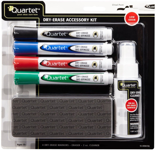 Nobo quartet whiteboard tilbehør kit- hjælper med at holde enhver whiteboard ser sit bedste i konferencelokaler, hjem og klasseværelser. Indeholder 4 tørslettemarkører med lav lugt (sort, rød, grøn og blå), 1 skumviskelæder og sprayrenser.