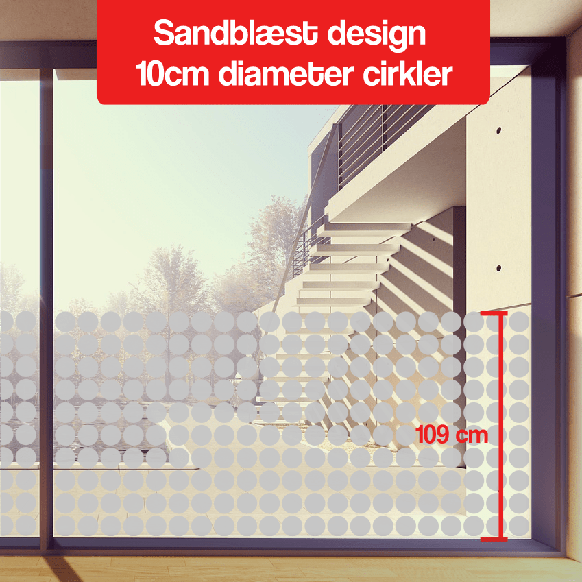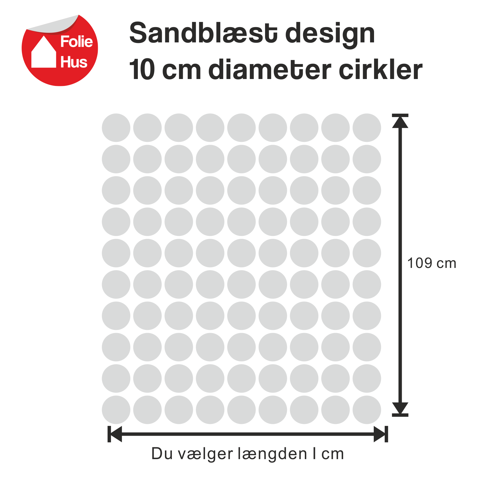 Denne sandblæst folie design er 109 cm i højden. Du kan vælge den ønskede længde af designet i centimeter, så længe det ikke overstiger den maksimale længde på 5 m Den består af cirkler med en diameter på 10 cm med en afstand på 1 cm mellem dem. Det er lavet af høj kvalitet matteret folie og et top applikationpapir lag, som bruges til lettere applikation og også beskyttelse Hvis du har spørgsmål eller ønsker, bedes du kontakte os via chat på siden af skærmen, eller e-mail: info@folie-hus.dk